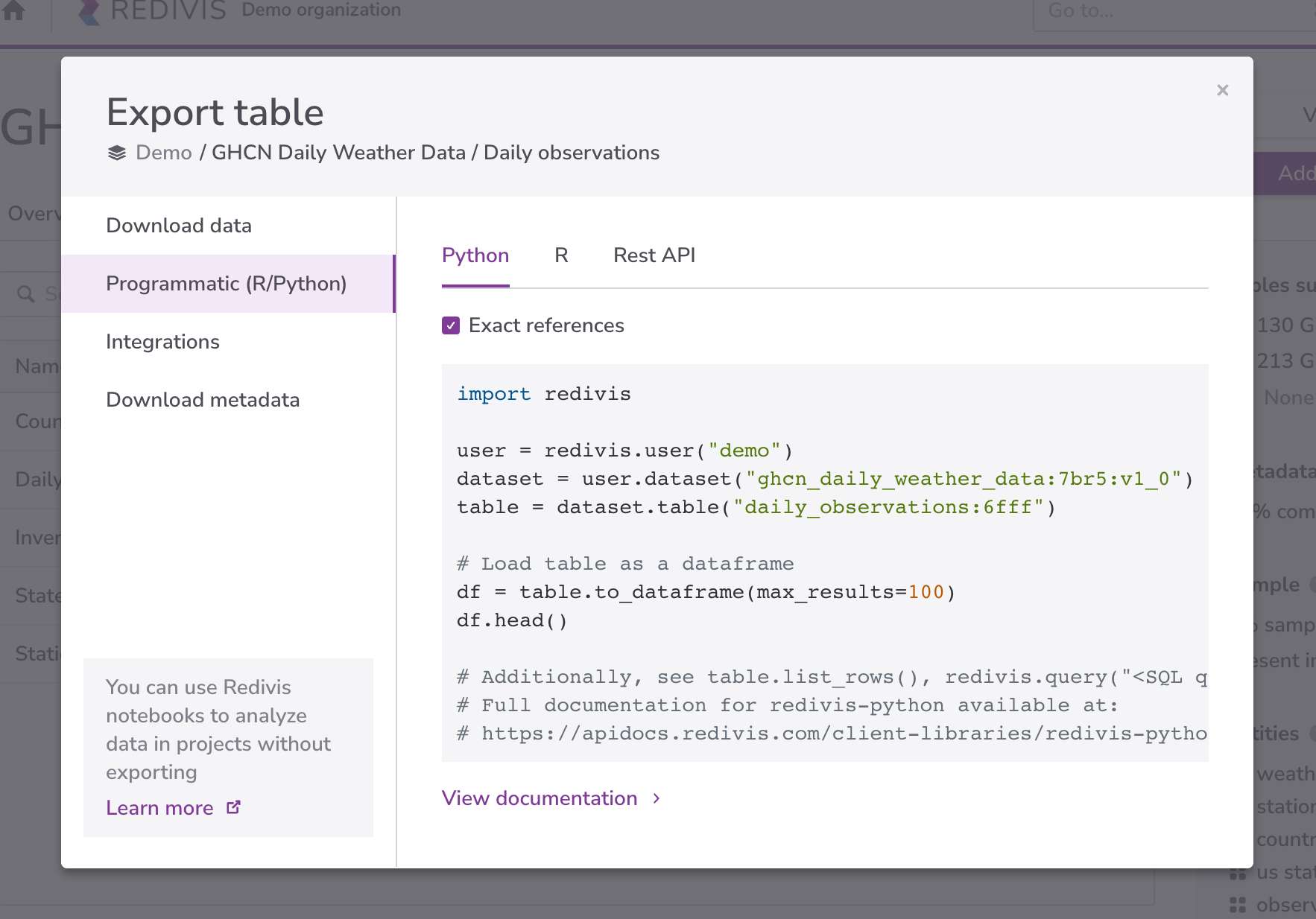 If you're writing code within Redivis (table queries, transforms, notebooks), the referenceId will generally be pre-populated for you. This section is generally only applicable if you're using the Redivis API from an external environment (e.g., a Jupyter notebook running on your computer).