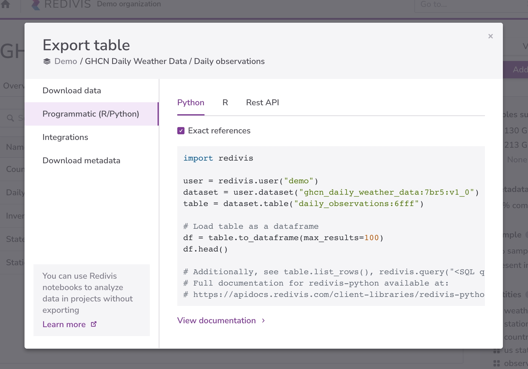 data <- table$to_tibble(max_results=100)import * as redivis from 'redivis'