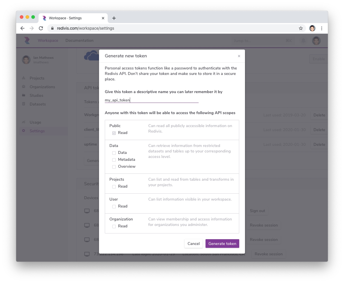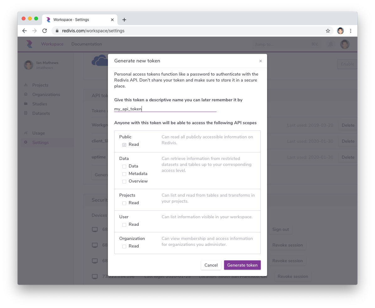 Access tokens that only have the public scope can be safely shared with others, and are useful for building integrations that should only access public content (for example, surfacing Redivis datasets through your library's search engine).