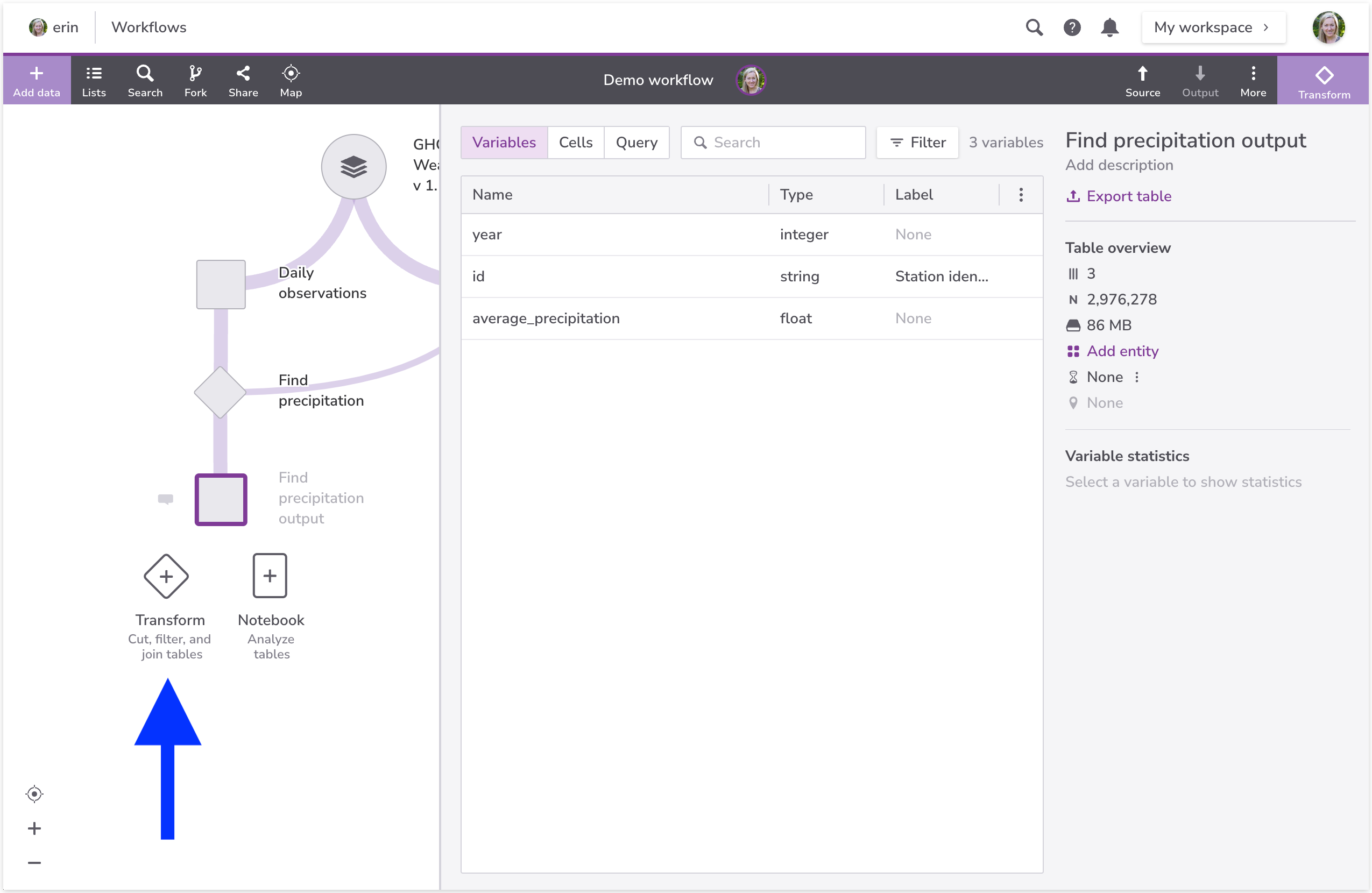 Once you've created a workflow and added a dataset to it that you'd like to work with, get started by creating a **Transform**. You can do this by clicking on any dataset or table.